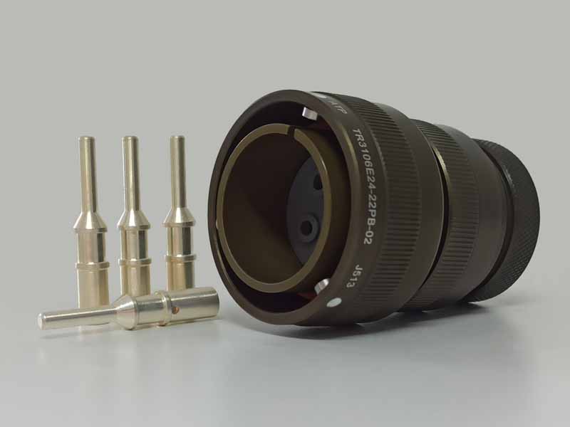 Shielded receptacle with endbell for shielding braid, and heat shrink boots. Style N1 with 4 threaded holes.
